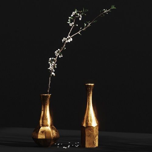 The set includes two aluminum vases and a cherry branch.